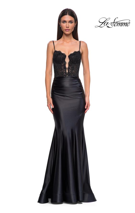 Classic La Femme prom dress with a fitted stretch satin skirt and horsehair hem. The bodice features illusion lace and a deep mesh V neckline. The edge of the neckline and back has a lace scallop edge. Back zipper closure.