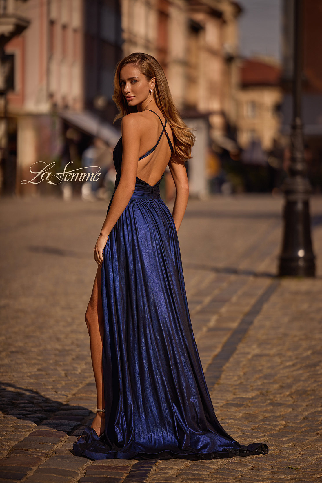 A-line metallic net jersey gown with a high slit and criss cross wrapped waistband. Deep V neckline and alter style straps. Back zipper closure.