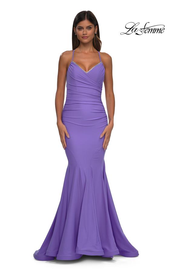 Flattering long gown with a dramatic flare skirt and ruching throughout the body. The V neckline and low back are embellished with lines of rhinestones. Back zipper closure.
