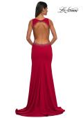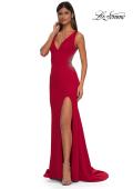 Gorgeous long dress with a ruched jersey skirt and lace up adjustable back. The bodice is sheer net with stunning seauin beaded lace applique. Back zipper closure.
