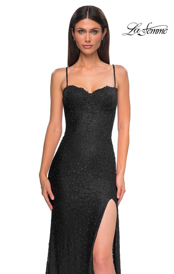 Perfect stretch lace long dress with sparkling rhinestones throughout the fabric. The neckline features lace scallop edges. Back zipper closure.