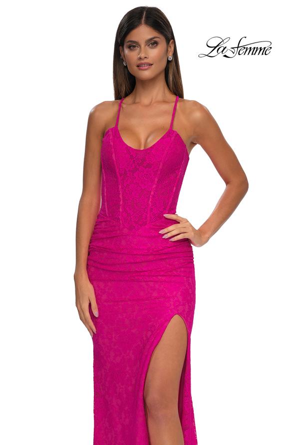 Beautiful stretch lace dress with ruching, high slit, and lace up back. The dress features a scoop neckline and exposed boning on the waist. Back zipper closure.