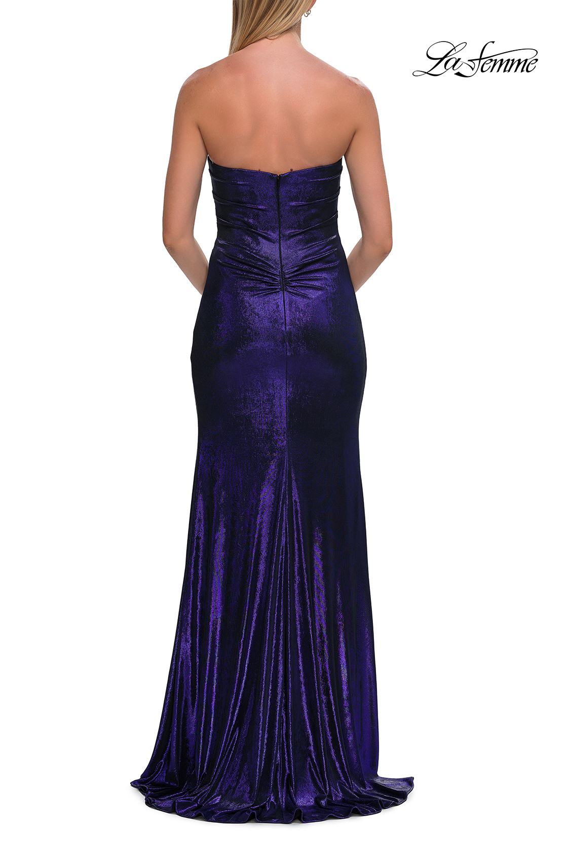 This strapless metallic jersey gown exudes effortless sophistication with a touch of modern glamour. The softly draped neckline and flattering ruching accentuate the figure, while the fitted silhouette flows into a sleek skirt with a thigh-high slit. Crafted from lustrous fabric that catches the light beautifully, this design is ideal for prom, evening events, or any occasion that calls for refined elegance. Back zipper closure.