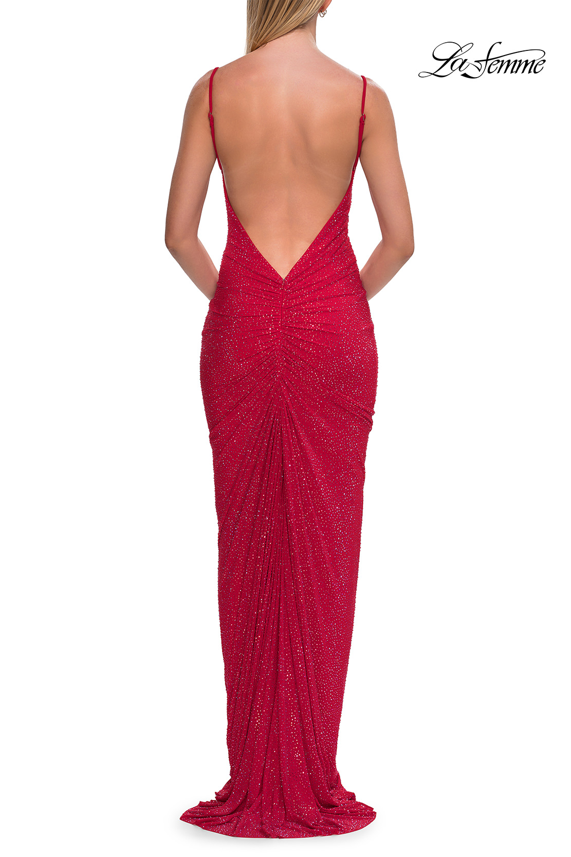 This stunning fitted gown sparkles with all-over rhinestone detailing for a glamorous, head-turning look. The draped cowl neckline and delicate straps add soft elegance, while the low open back and gathered ruching create a flattering silhouette. Made from stretch fabric that moves effortlessly. Back zipper closure.