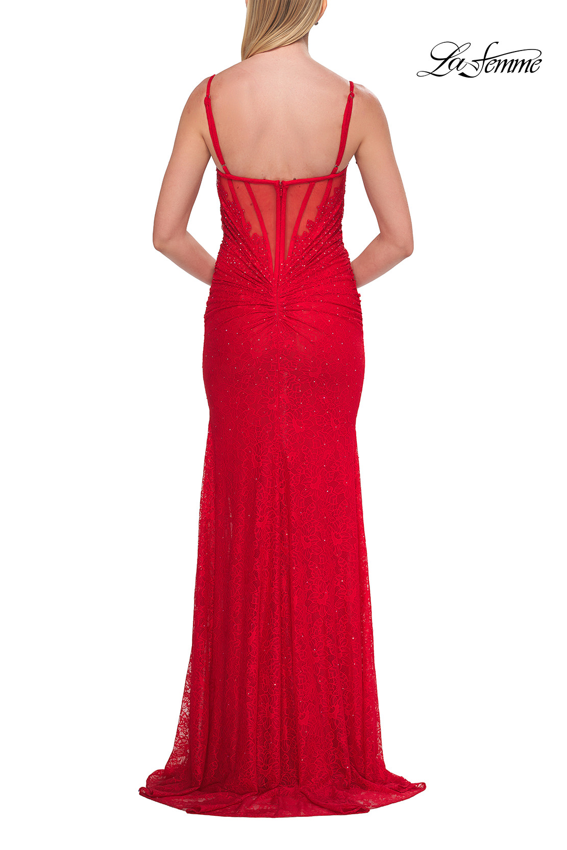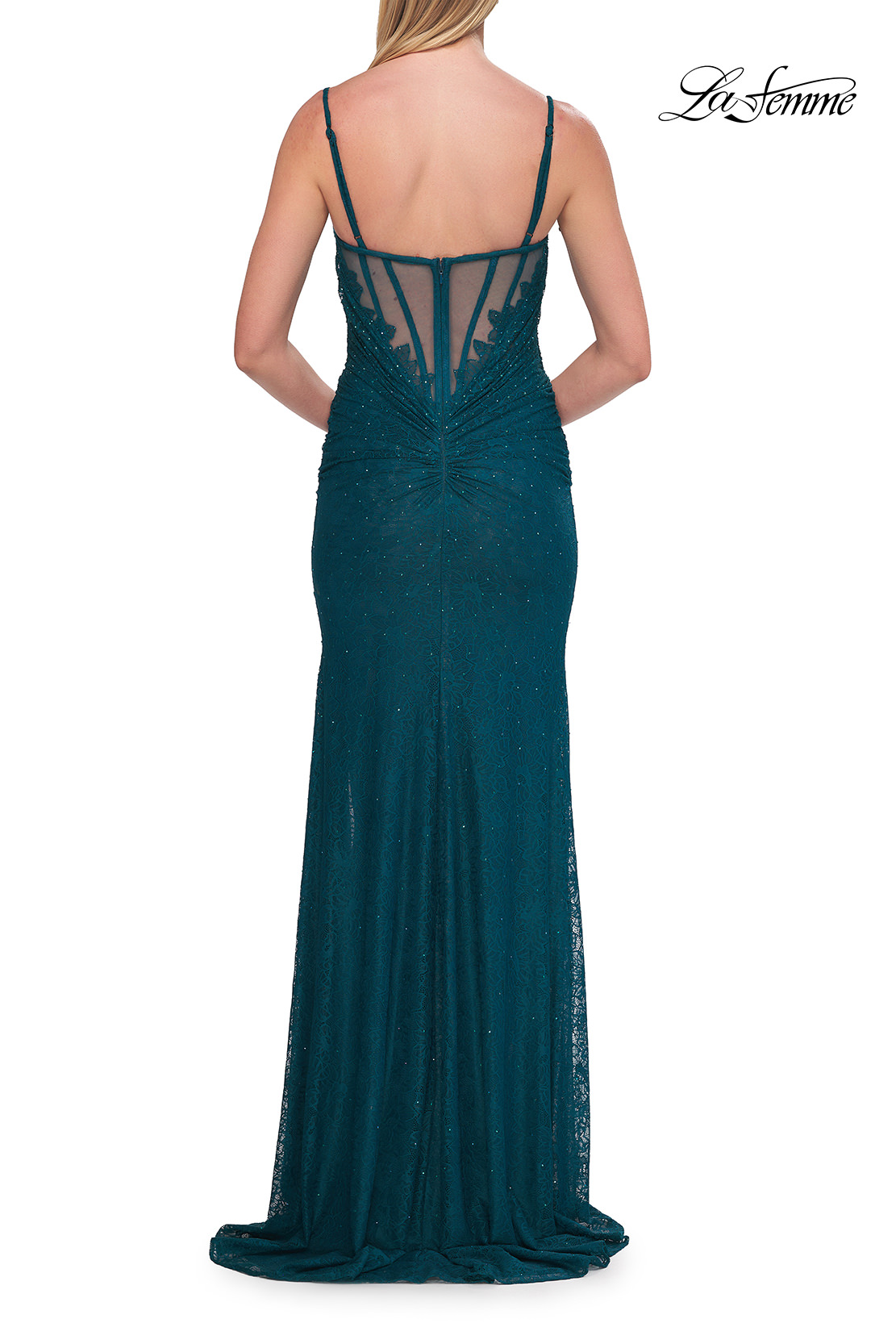 This fitted gown radiates timeless elegance with its delicate lace design and subtle sparkle. Featuring a flattering V-neckline with thin straps, the gown hugs the figure through artful ruching and a high slit that adds a touch of allure. The sheer boned back creates a modern, fashion-forward finish. Back zipper closure.