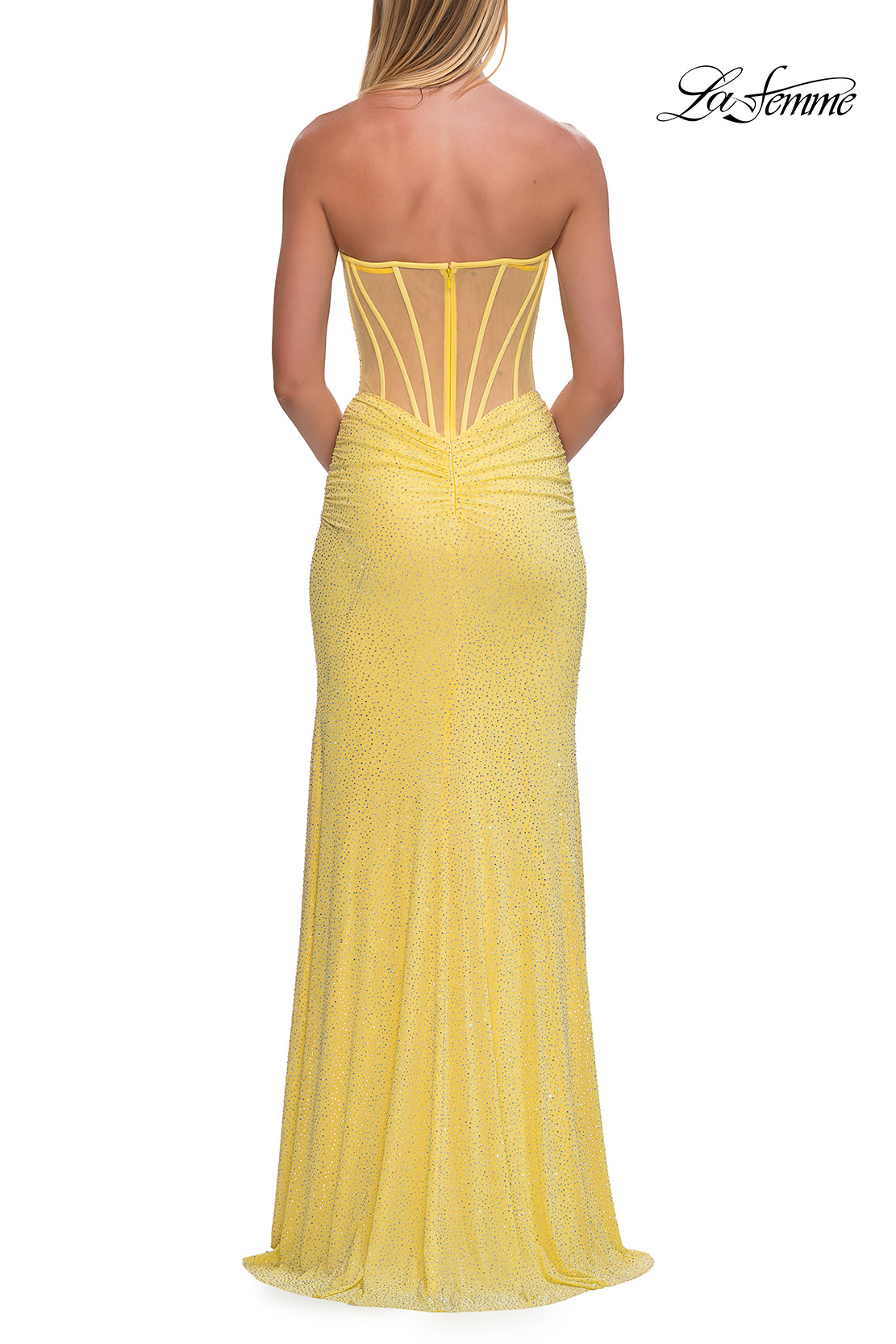 This glamorous strapless gown is designed to make a bold entrance. The rhinestone-studded fabric catches the light from every angle, while the sweetheart neckline with a daring keyhole cutout adds a touch of allure. The fitted silhouette and high slit create a sleek, figure-flattering look, complete with a sheer corset-style back for modern sophistication. Back zipper closure.