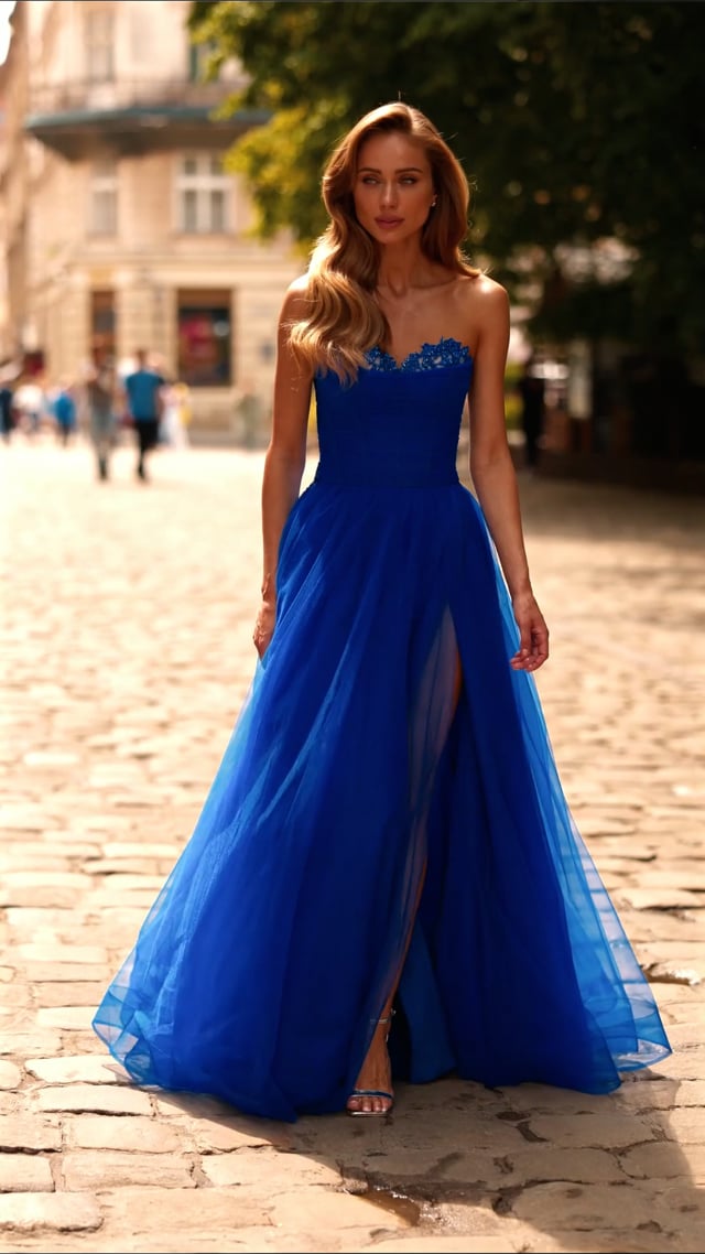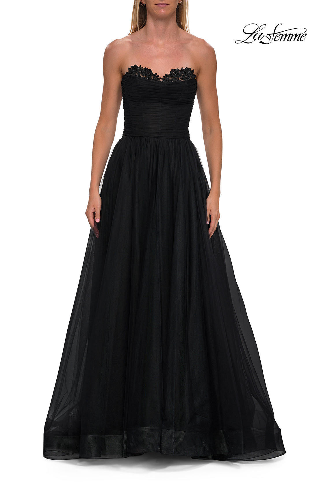 This romantic A-line tulle gown features a strapless corset bodice with delicate lace embroidery and structured boning for a flattering fit. The flowing tulle skirt adds soft volume and movement, while the high slit creates a modern, feminine touch