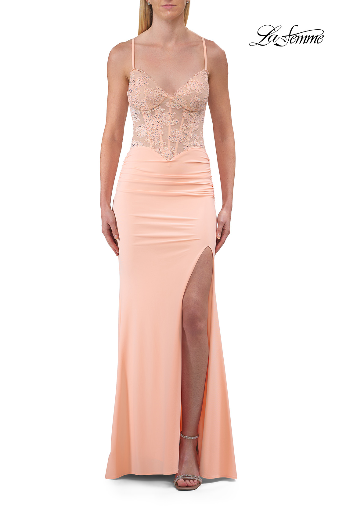 This sleek fitted gown combines elegance and allure with its lace-embellished sheer bodice and delicate straps. The design features a flattering ruched skirt with a high slit that adds movement and sophistication. The open crisscross back completes the look. Back zipper closure.