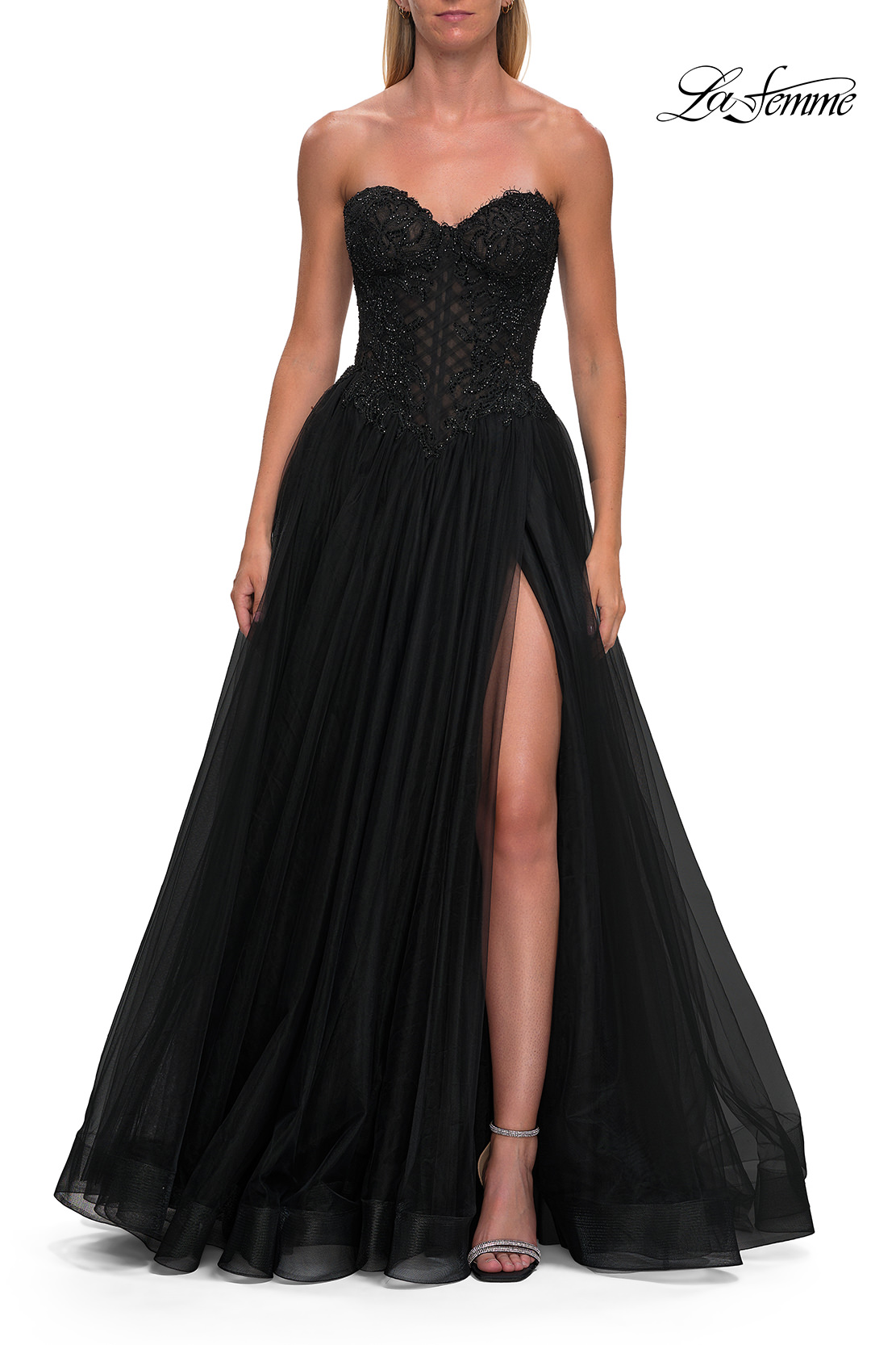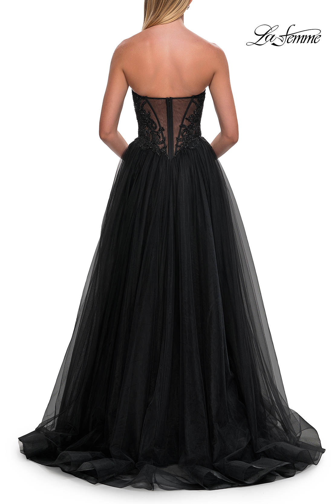 This breathtaking strapless ball gown features a sheer corset bodice adorned with intricate beading and embroidery for a touch of glamour. The voluminous tulle skirt flows gracefully, creating an ethereal silhouette, while the high slit adds a modern, flirty edge. Back zipper closure.