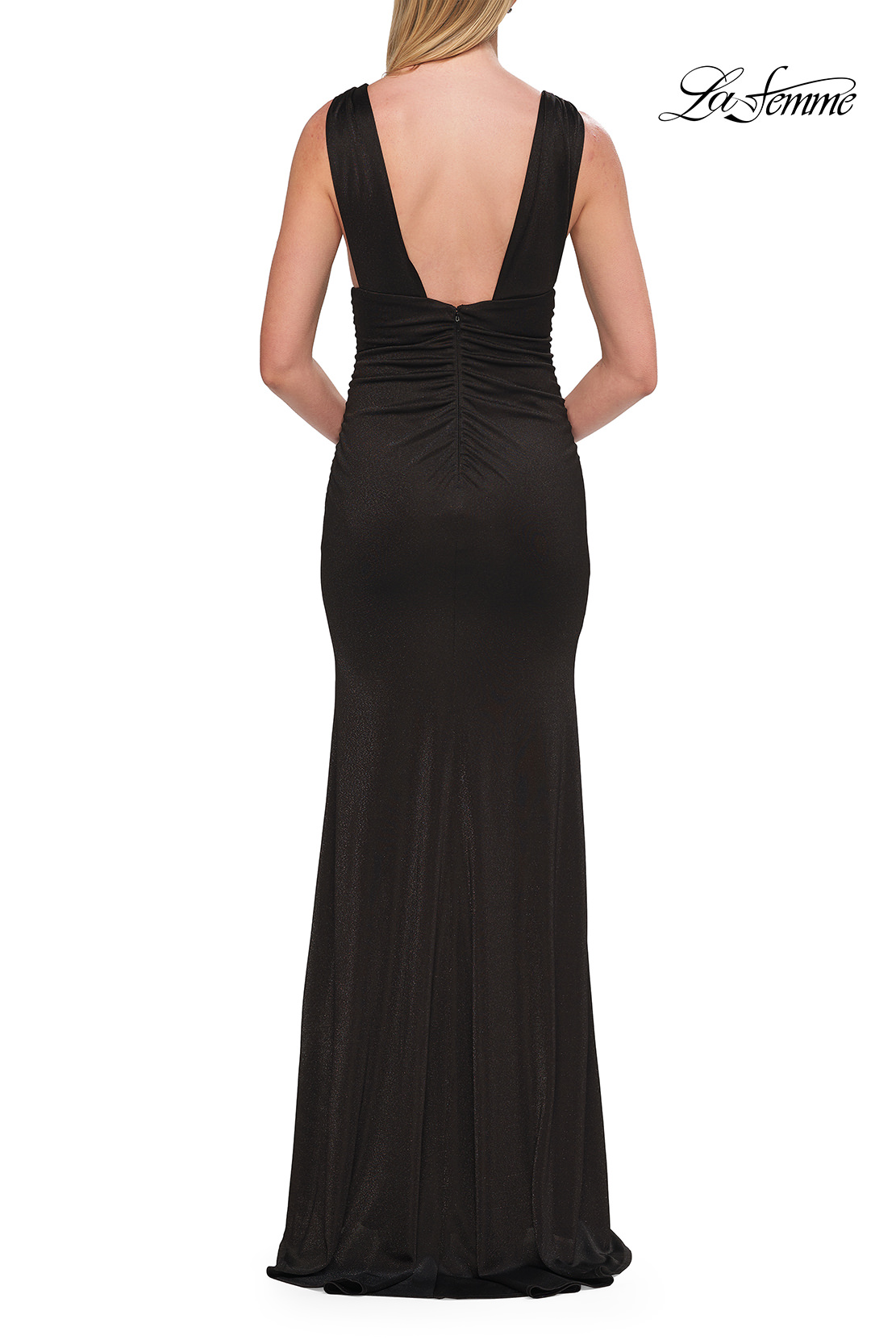 Sophisticated and sleek, this fitted metallic jersey gown features a flattering V-neckline and gentle ruching that enhances your natural shape. The shimmering fabric catches the light with every move, while the low open back adds a touch of allure. Back zipper closure.