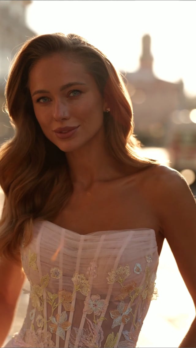 Romantic and ethereal, this strapless gown features a structured sheer corset bodice adorned with delicate 3D floral appliqués that cascade down the flowing tulle skirt. The high slit adds a modern, flirty touch, while the lace-up back ensures a perfect, adjustable fit. Back zipper closure.
