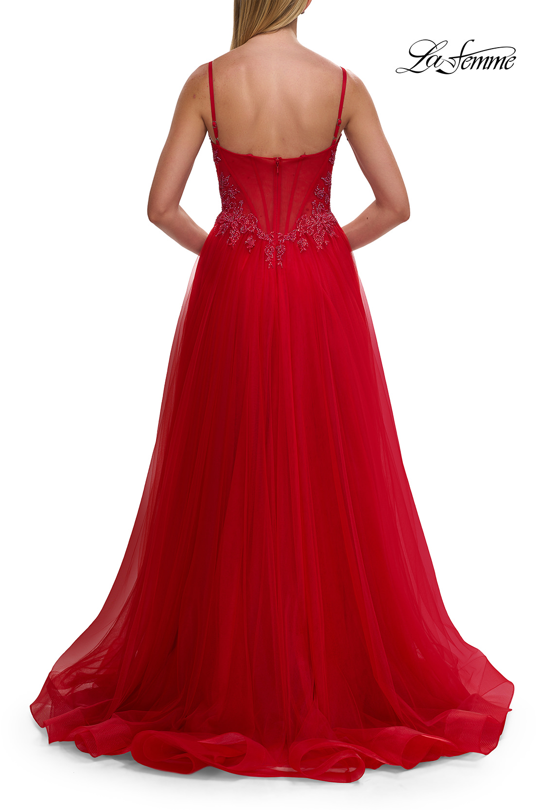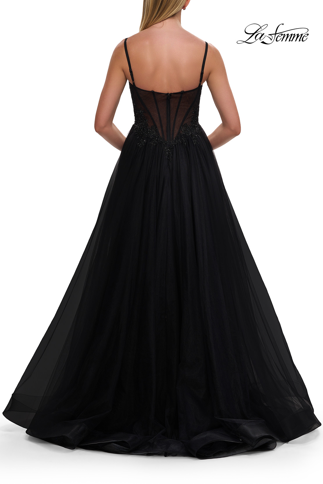 This elegant A-line gown features a sheer corset-style bodice adorned with lace and delicate spaghetti straps. The flowing tulle skirt opens into a high slit, adding a touch of modern allure while maintaining timeless sophistication. Back zipper closure.