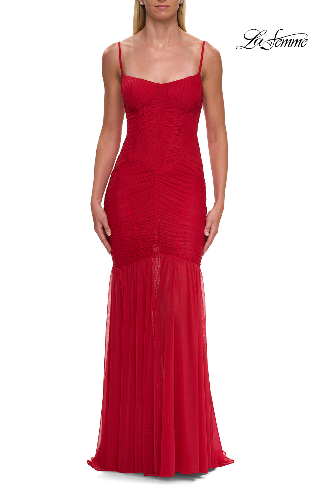 This sleek fitted net jersey gown features delicate ruching throughout the bodice and hips, creating a beautifully sculpted silhouette. The design includes a structured neckline with thin straps and a soft sheer flared hem that adds movement and elegance. Crafted from lightweight mesh for a comfortable yet flattering fit. Back zipper closure.