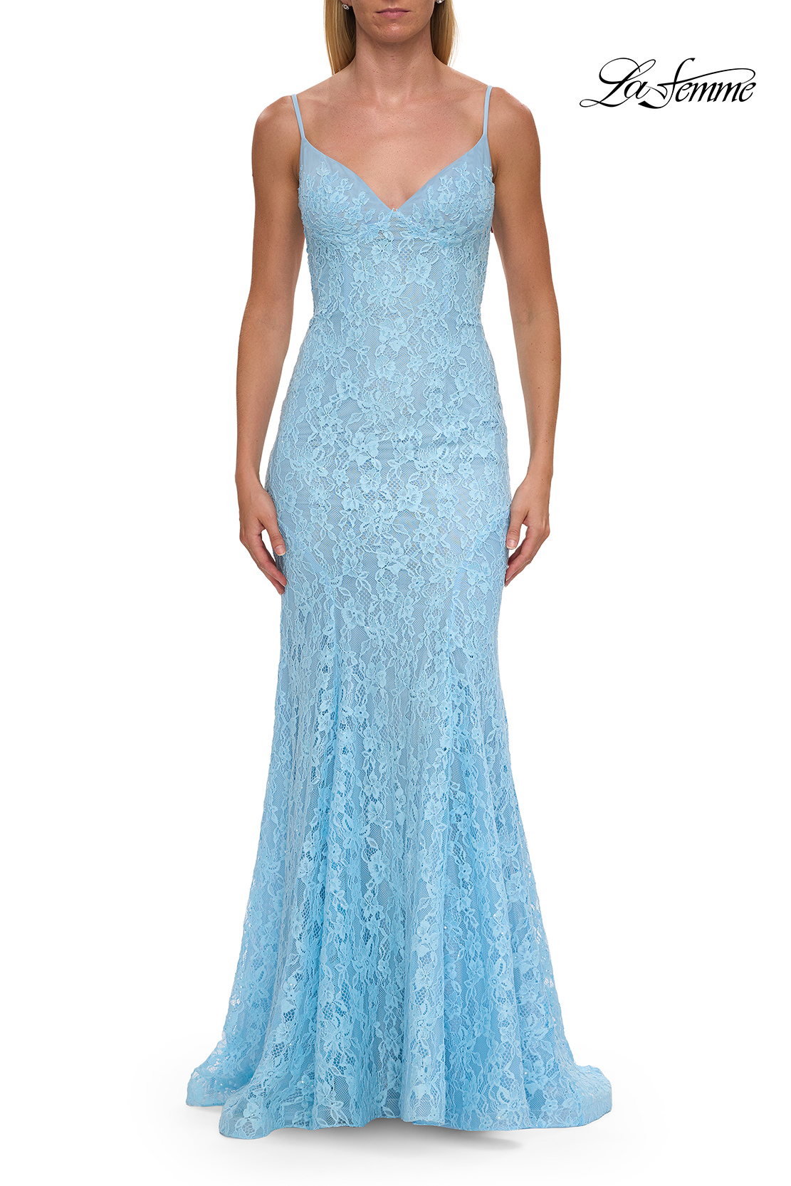 This elegant fitted gown features delicate allover stretch lace and a flattering V-neckline with thin spaghetti straps. The design hugs the figure beautifully, while the sheer back adds a touch of modern allure. Back zipper closure.