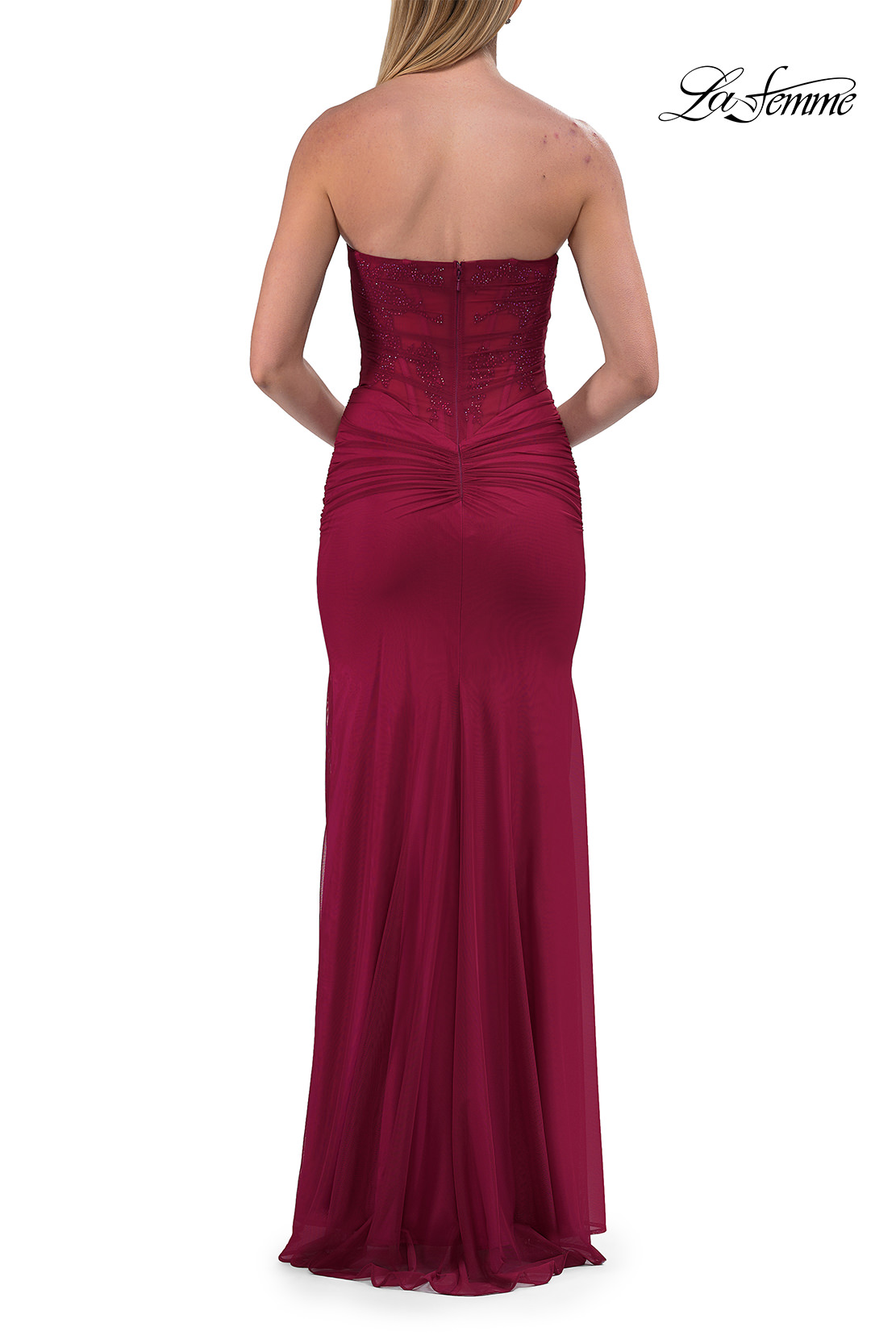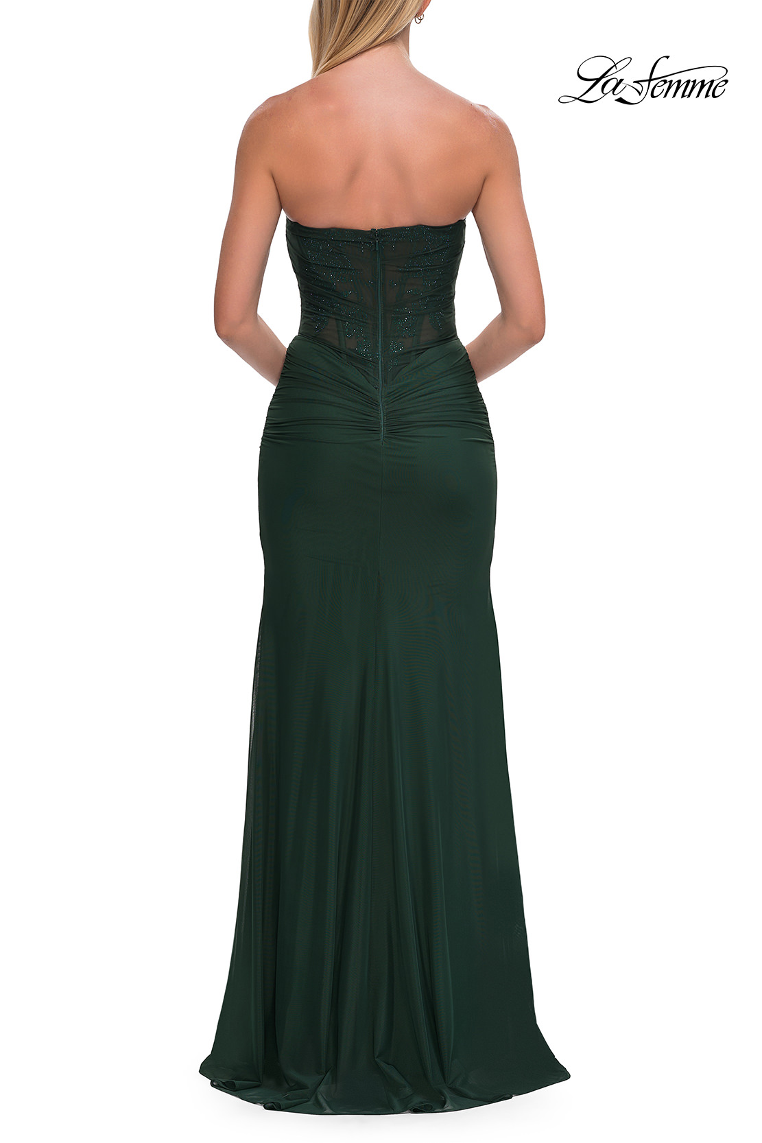 This elegant strapless gown features a structured corset bodice with delicate lace details and a softly draped neckline. The fitted jersey skirt includes flattering ruching that accentuates your shape, paired with a high slit for added allure. Back zipper closure.