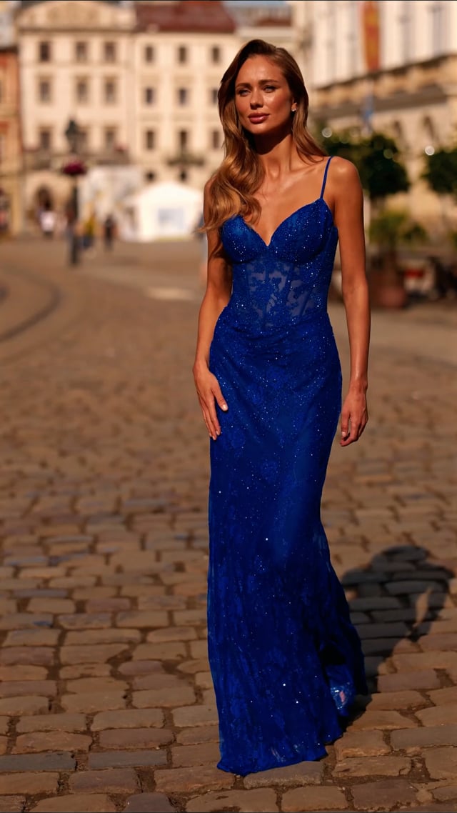 This elegant lace gown showcases a sheer corset-style bodice with delicate lace embroidery and a figure-hugging silhouette. The sleek spaghetti straps add a modern, feminine touch, while the soft stretch lace ensures a comfortable and flattering fit. Back zipper closure.