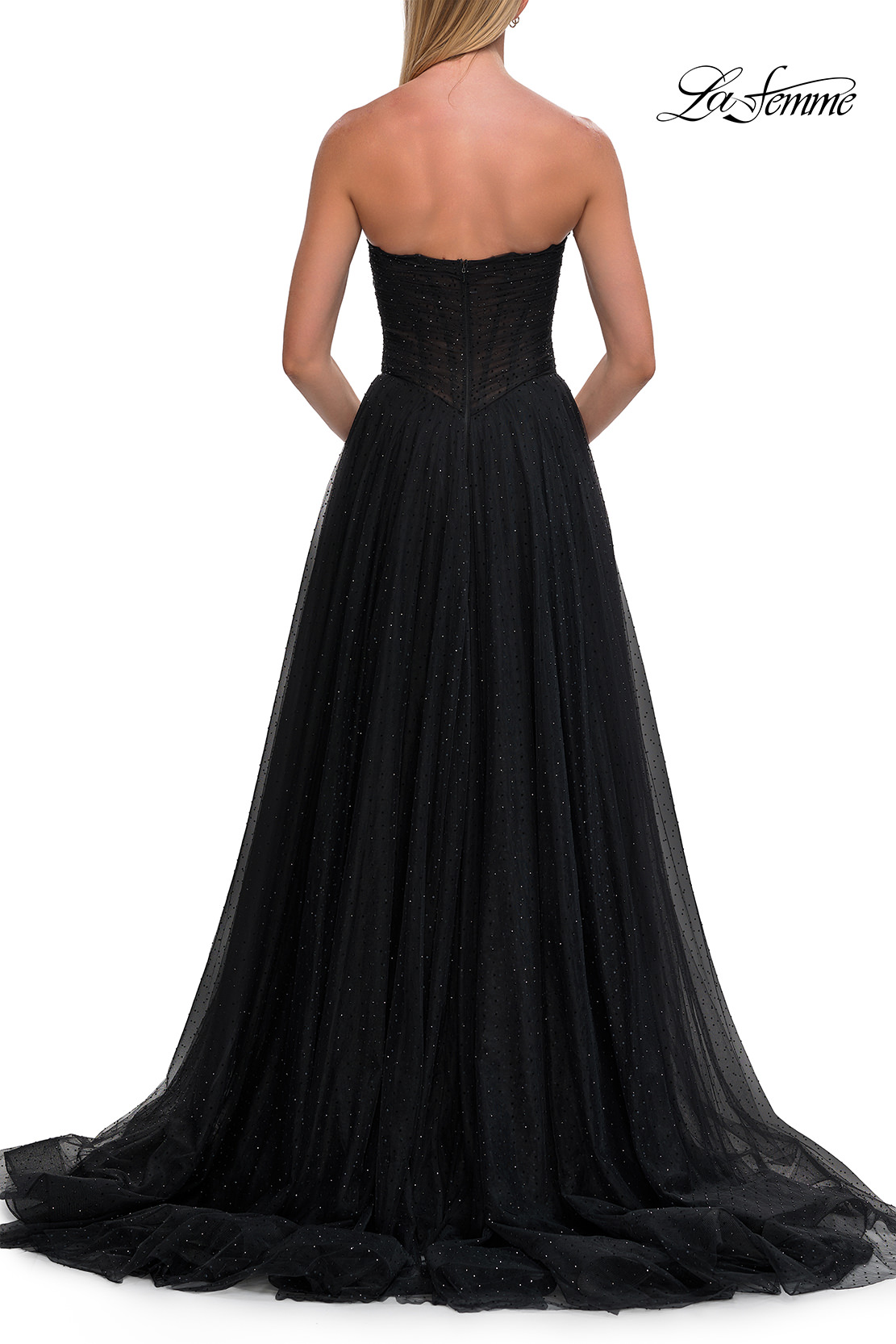 This stunning strapless gown features a sweetheart neckline and a fully rhinestone fabric that sparkles with every step. The flowing A-line skirt adds a touch of drama with a daring high slit and a sweep train for graceful movement. Back zipper closure.
