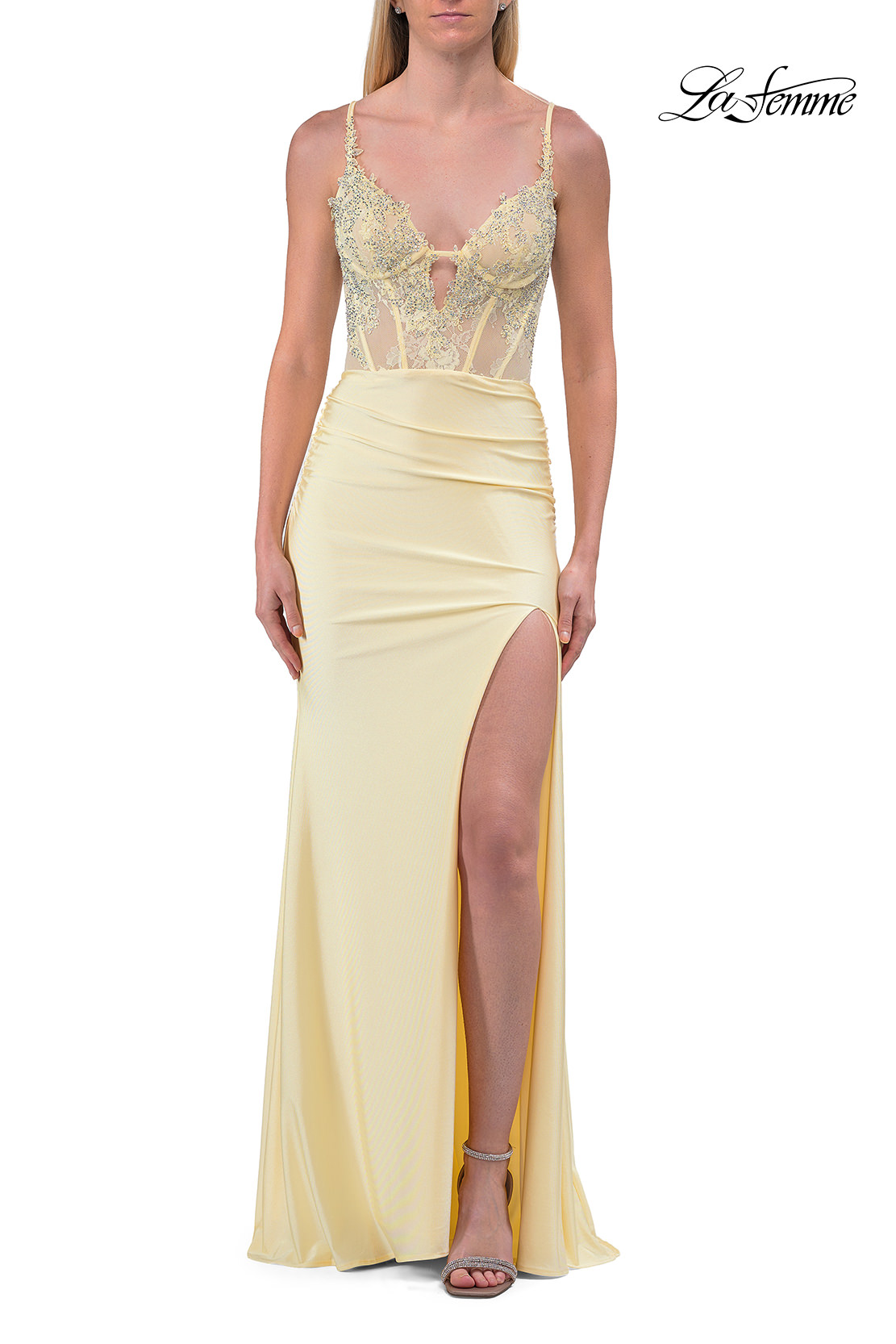 This fitted evening gown features a plunging beaded lace bodice with sheer detailing and thin spaghetti straps for a delicate, feminine look. The sleek jersey skirt flows gracefully with a high side slit that adds a touch of allure. A lace-up open back and subtle ruching create a flattering, sculpted silhouette. Back zipper closure.