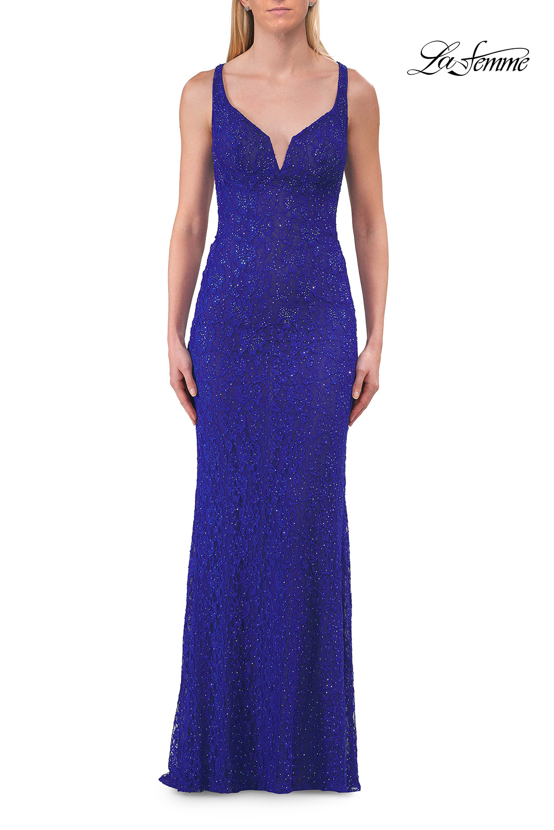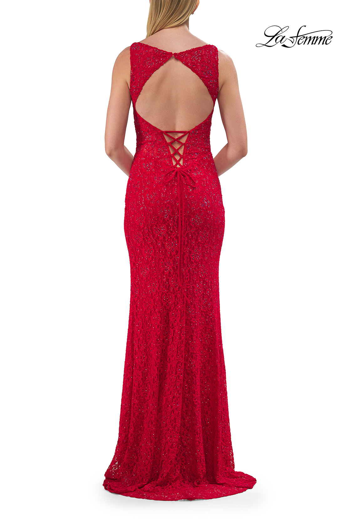 This elegant fitted gown features a lace overlay embellished with delicate beadwork that adds subtle sparkle from every angle. The design showcases a flattering neckline with slender straps and a dramatic open back accented by lace-up detailing. Back zipper closure.