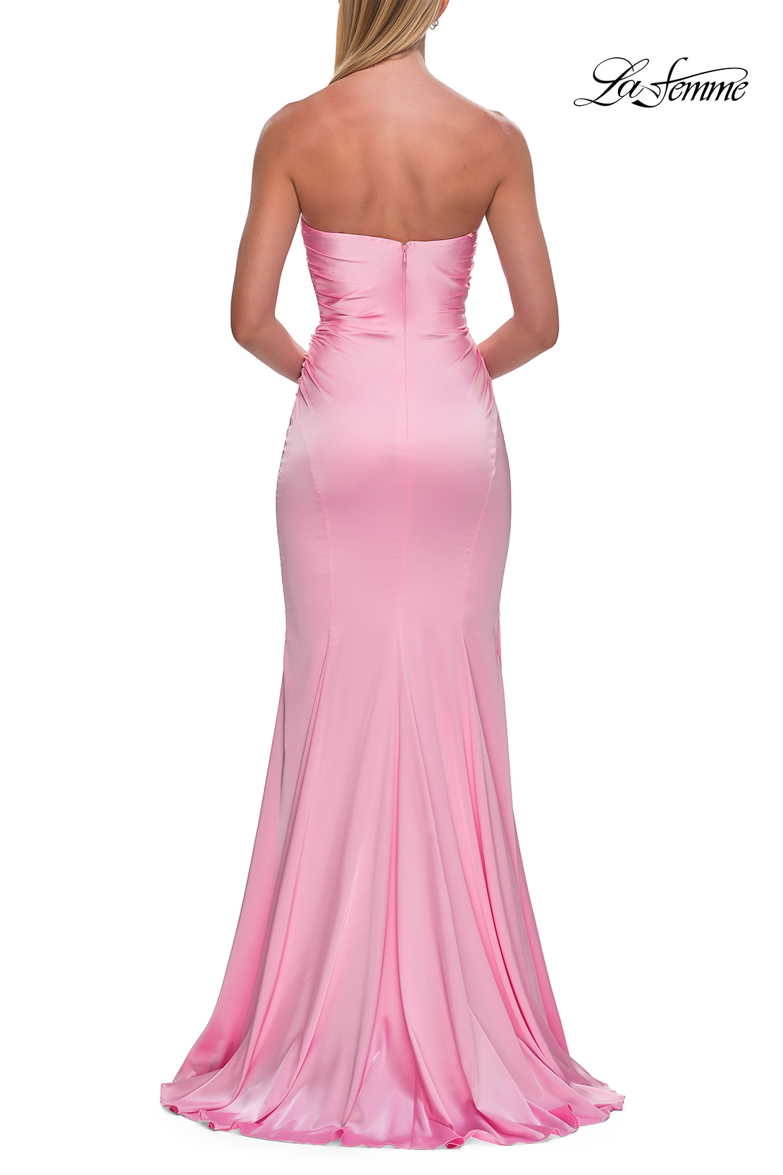 This sleek strapless gown is designed in smooth satin for a timeless, sophisticated look. The ruched bodice creates a flattering, body-contouring effect, while the fitted skirt flows gracefully into a subtle train. Back zipper closure.