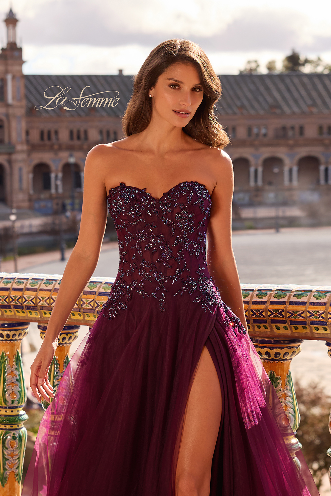 This enchanting strapless gown features a fitted, embroidered bodice that sparkles with delicate detailing. The sheer tulle skirt flows effortlessly into a soft A-line silhouette, highlighted by a high slit for a touch of modern allure. Back zipper closure.