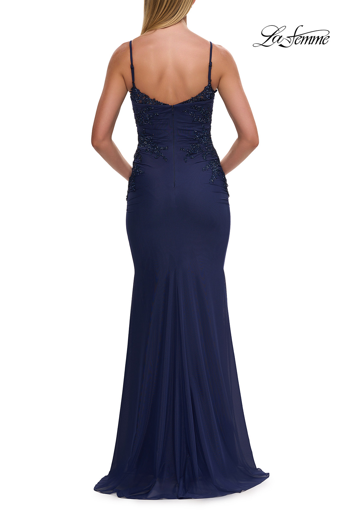 This fitted jersey gown features intricate beaded lace appliqués that accentuate the bodice and neckline for a touch of elegance. The design includes delicate spaghetti straps, flattering ruching, and a sleek skirt with a thigh-high slit that adds just the right amount of allure. Back zipper closure.