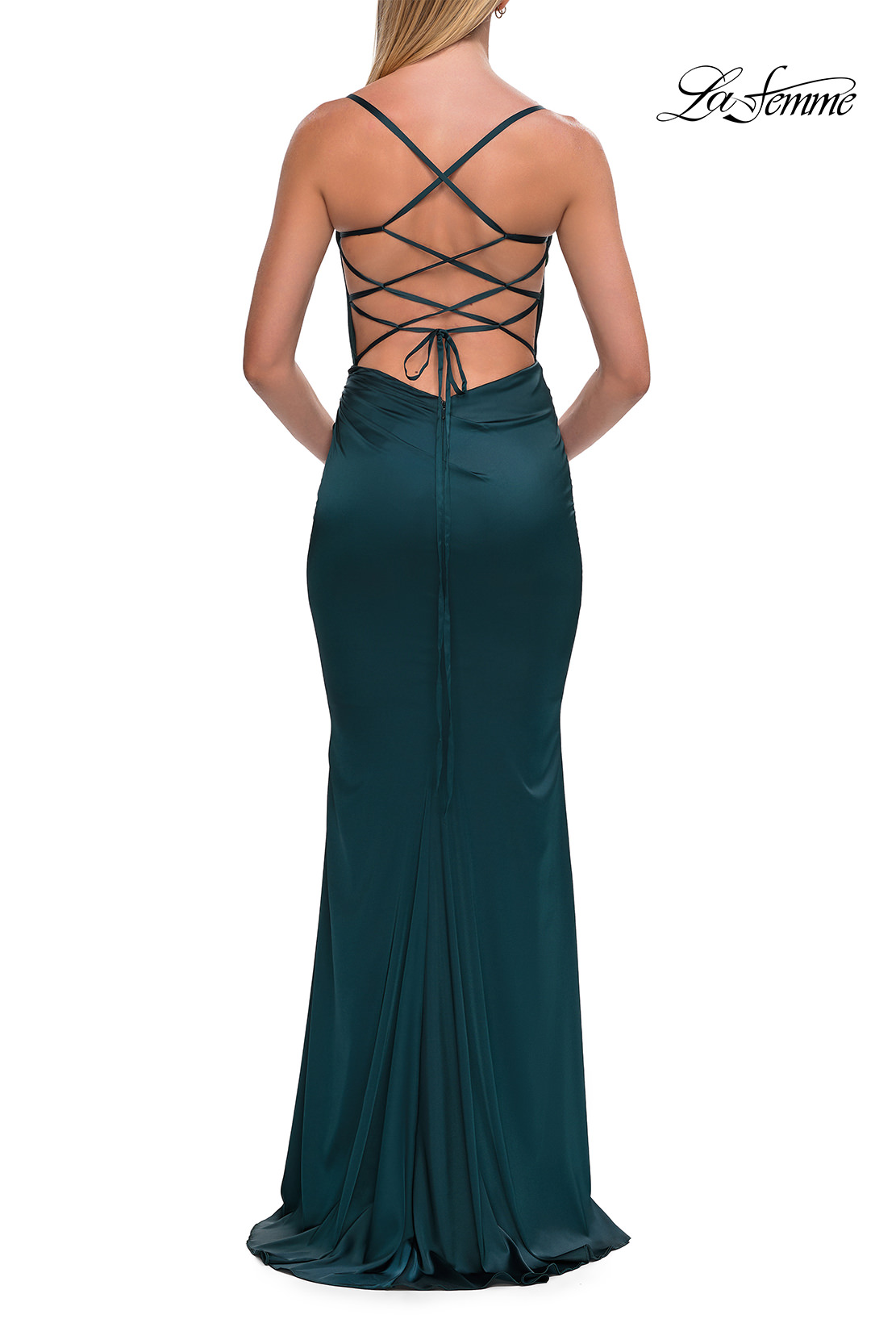This sleek satin gown features a softly draped cowl neckline and delicate spaghetti straps for a timeless, feminine look. The fitted silhouette flatters the figure, while the open lace-up back adds a touch of allure. Finished with subtle ruching at the waist and a flowing skirt. Back zipper closure.