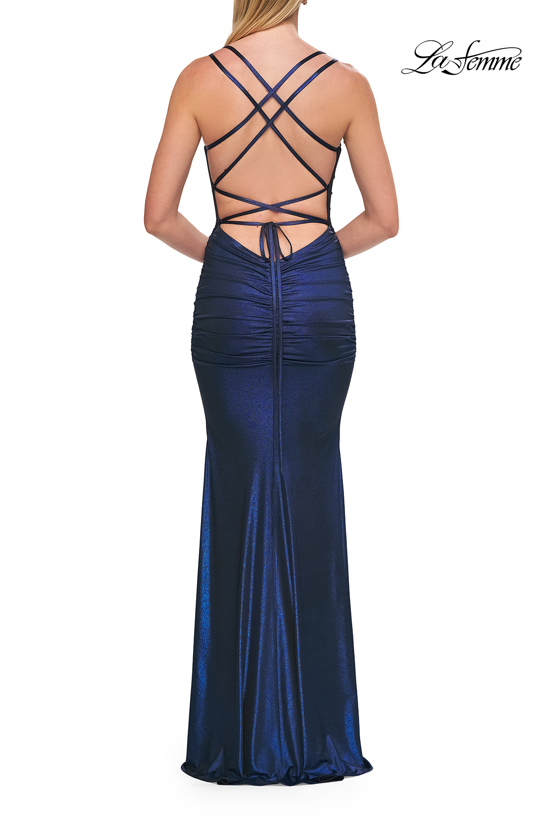 This stunning fitted gown features a sleek cowl neckline and double shoulder straps for an elegant modern look. The open lace-up back adds an alluring touch, while the ruching throughout the bodice and hips flatters the figure. Designed with a soft stretch metallic fabric that drapes beautifully, this gown is perfect for prom, evening events, or any glamorous occasion. Back zipper closure.