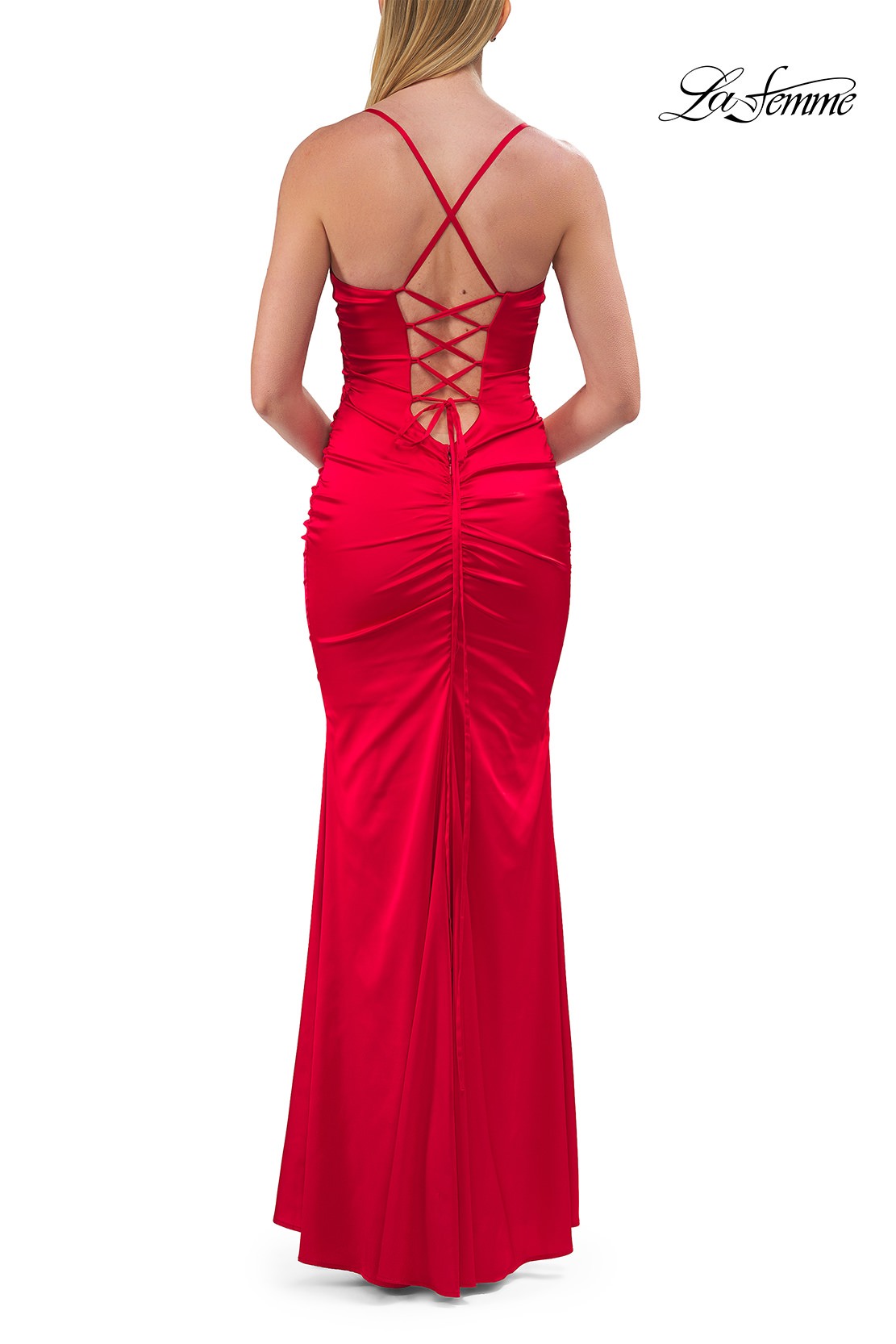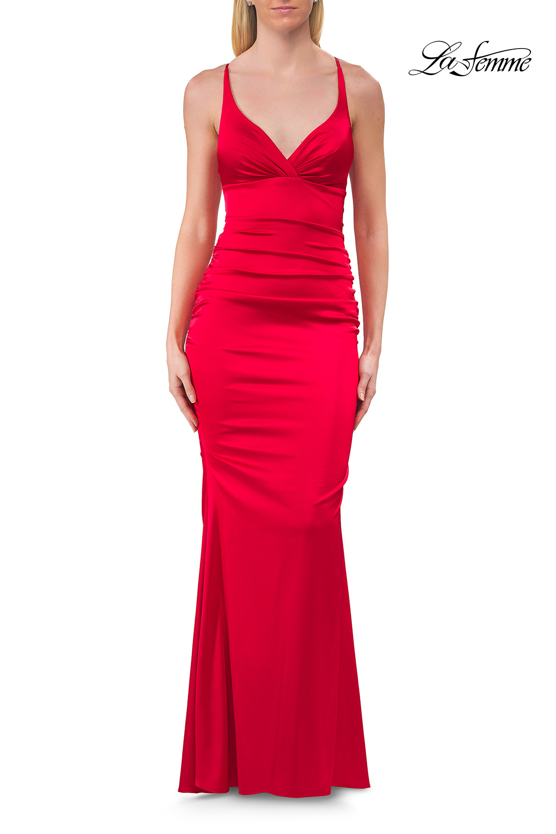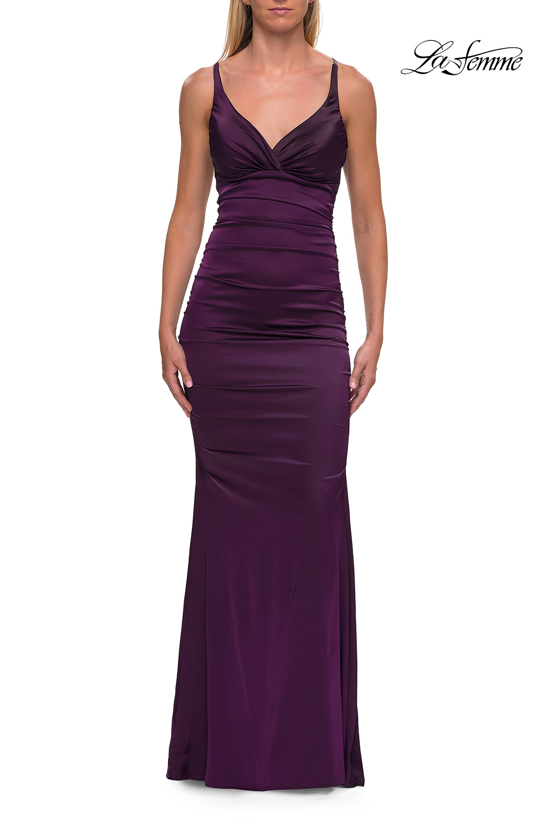 This sleek fitted gown showcases a flattering V-neckline with ruched detailing that enhances the bust and waistline. The smooth satin fabric drapes beautifully over the figure, flowing into a soft mermaid-style skirt. A lace-up open back adds a sultry finish. Back zipper closure.