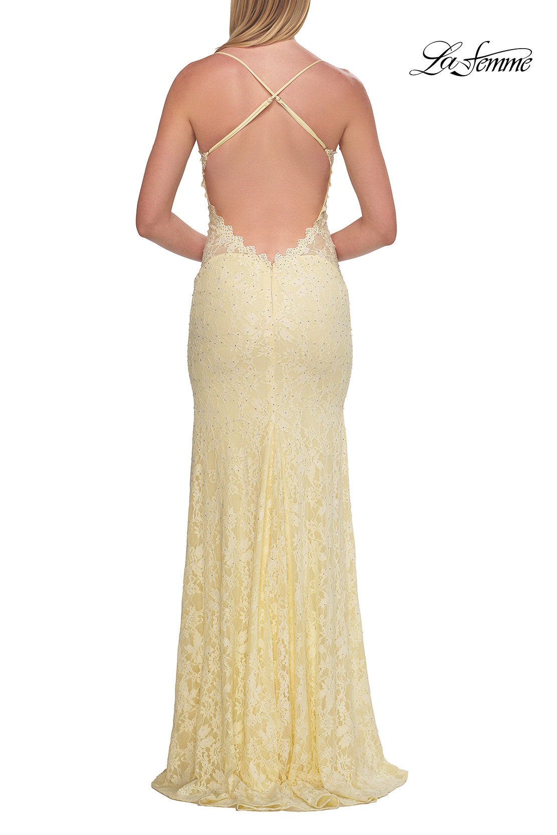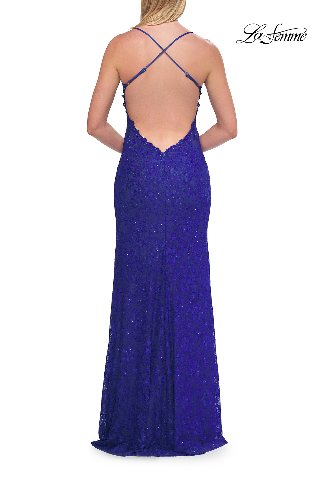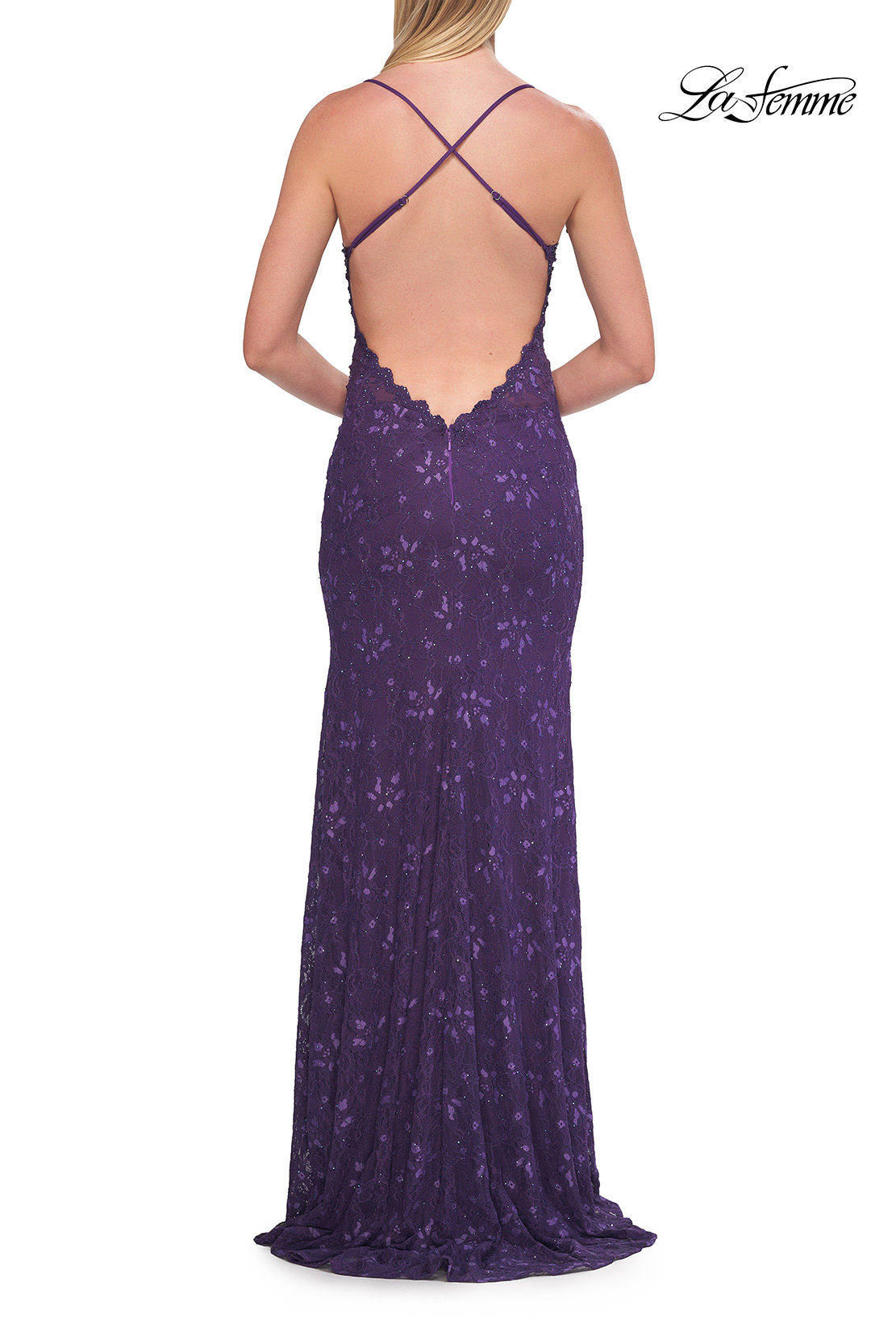 This fitted lace gown features a romantic scalloped neckline and delicate beading throughout for a subtle sparkle. The slim straps lead to an open back with a flattering low cut, while a side slit adds a modern, alluring touch. Back zipper closure.