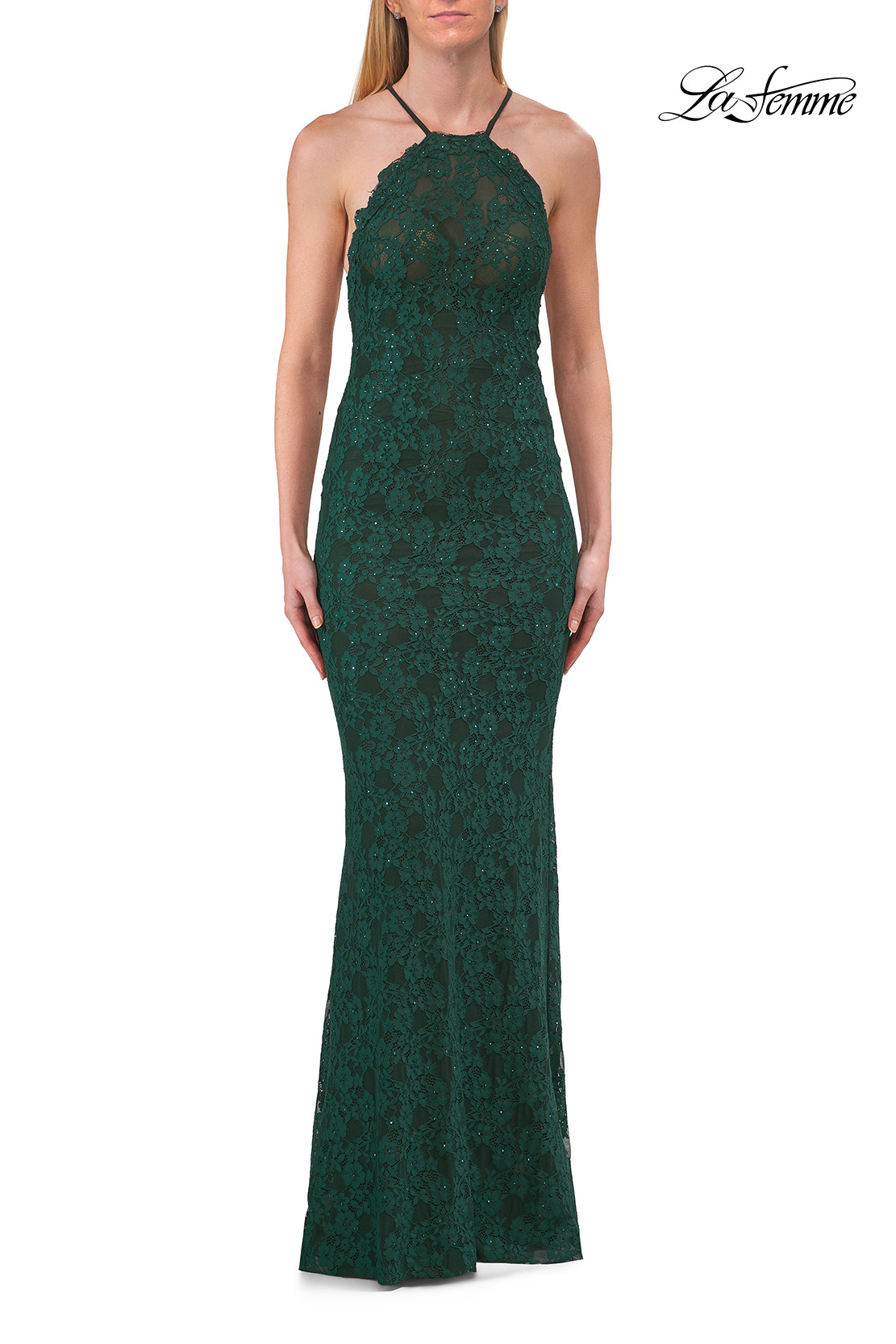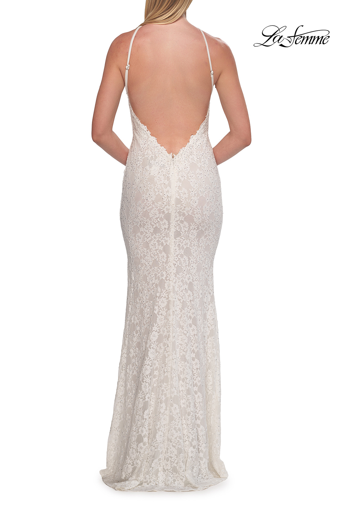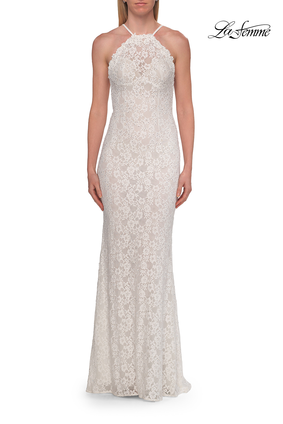 This elegant fitted lace gown showcases a halter neckline with delicate beaded embellishments for a refined shimmer. The open back adds a captivating touch, while the slim silhouette highlights the figure beautifully. Back zipper closure.