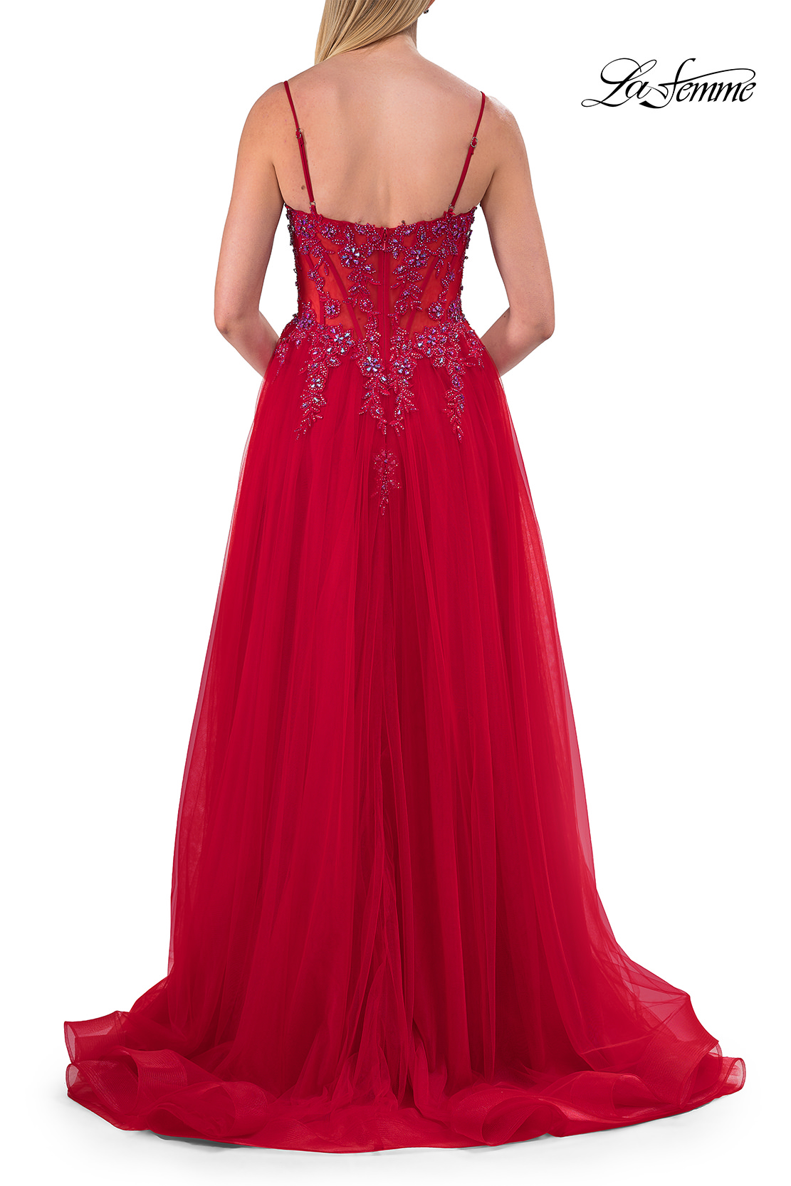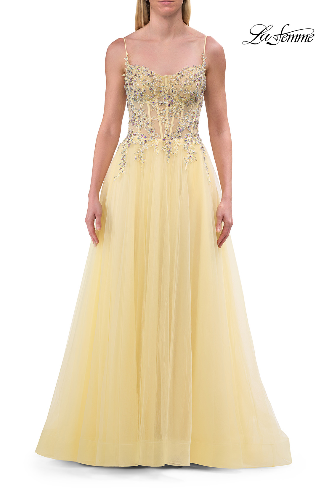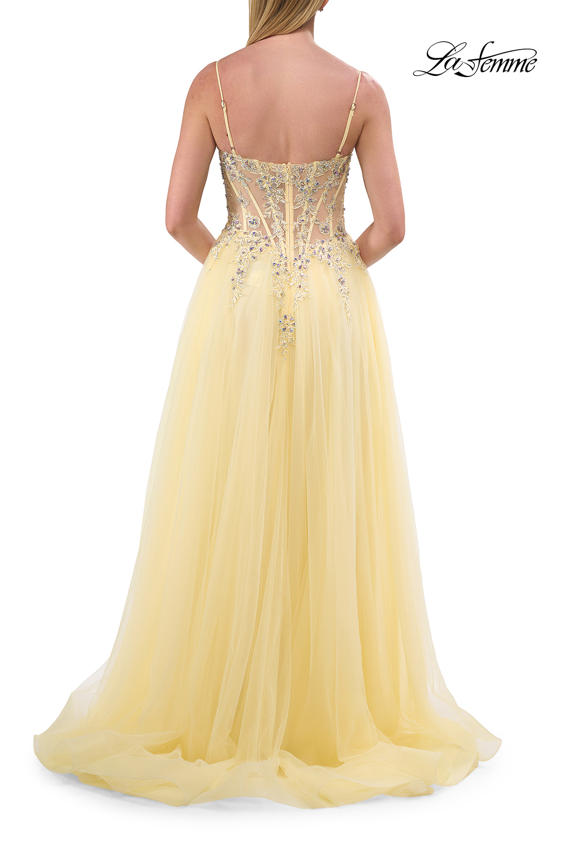 This enchanting A-line gown features a sheer beaded lace corset bodice with delicate straps and a flowing tulle skirt. The flattering design includes a thigh-high slit that adds a touch of allure to its elegant silhouette. Back zipper closure.
