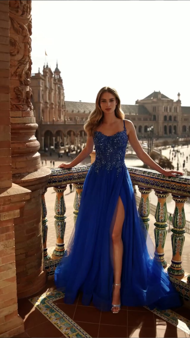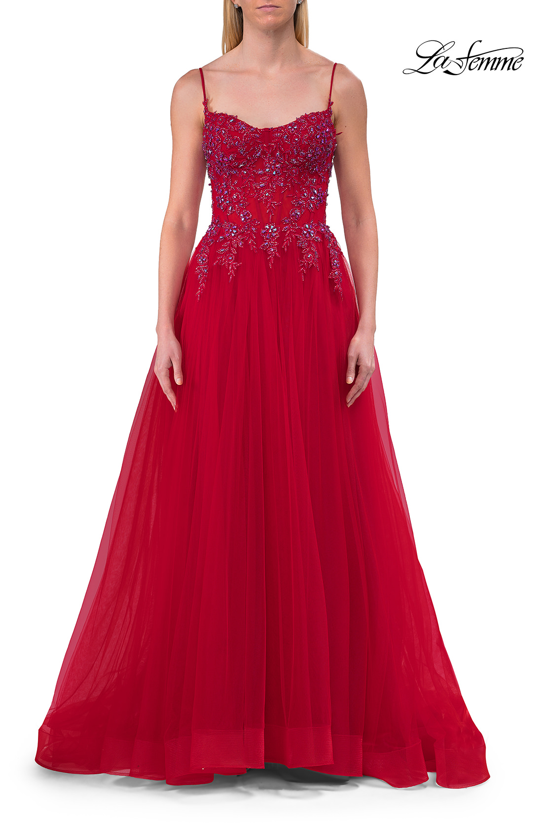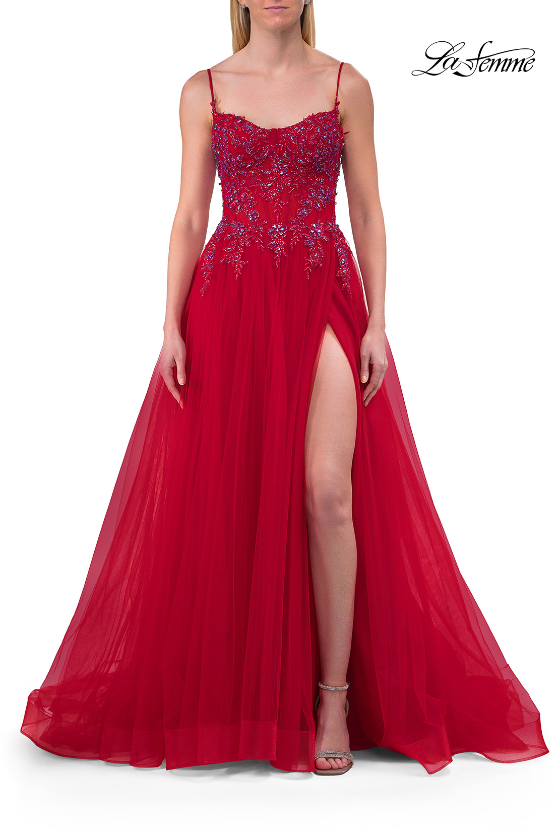 This enchanting A-line gown features a sheer beaded lace corset bodice with delicate straps and a flowing tulle skirt. The flattering design includes a thigh-high slit that adds a touch of allure to its elegant silhouette. Back zipper closure.