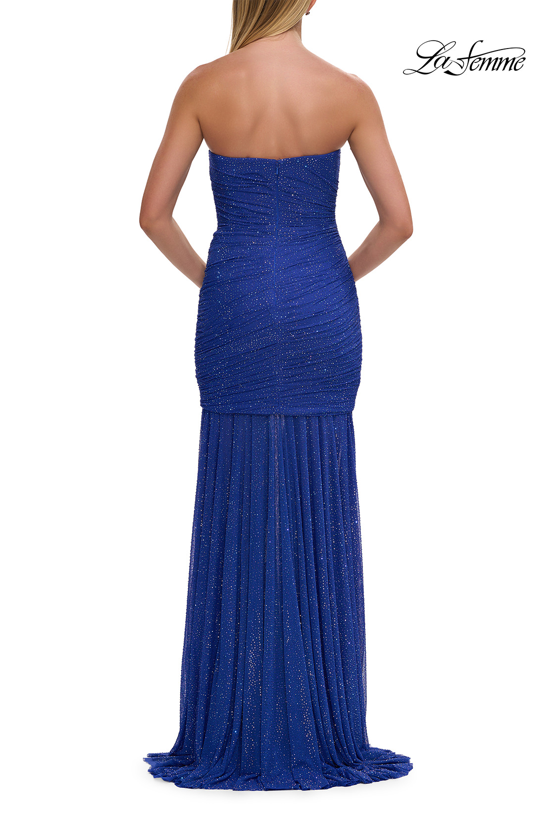 This strapless fitted gown sparkles with allover rhinestones and features elegant ruching throughout the bodice for a flattering fit. The sheer skirt overlay adds a touch of allure while maintaining graceful movement.