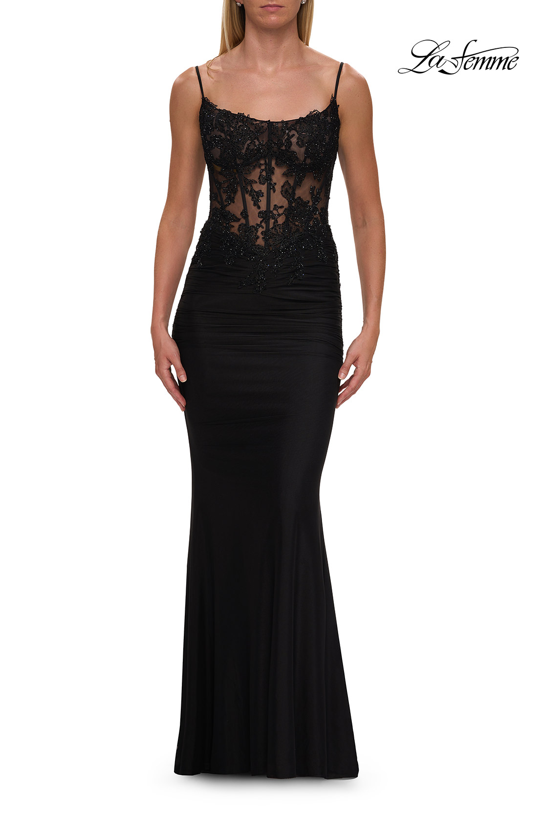 This stunning gown features a sheer corset bodice adorned with intricate beaded lace appliqué. The fitted silhouette highlights the figure with elegant ruching and a smooth, floor-length skirt. Thin straps and a scoop neckline complete this timeless, sophisticated look. Back zipper closure.