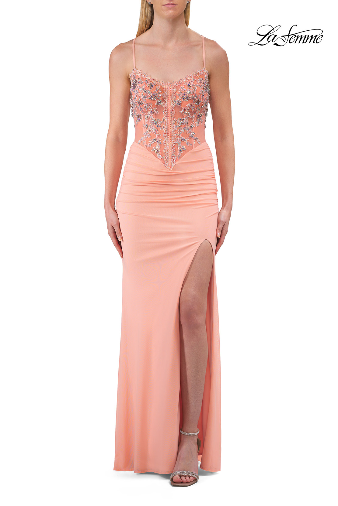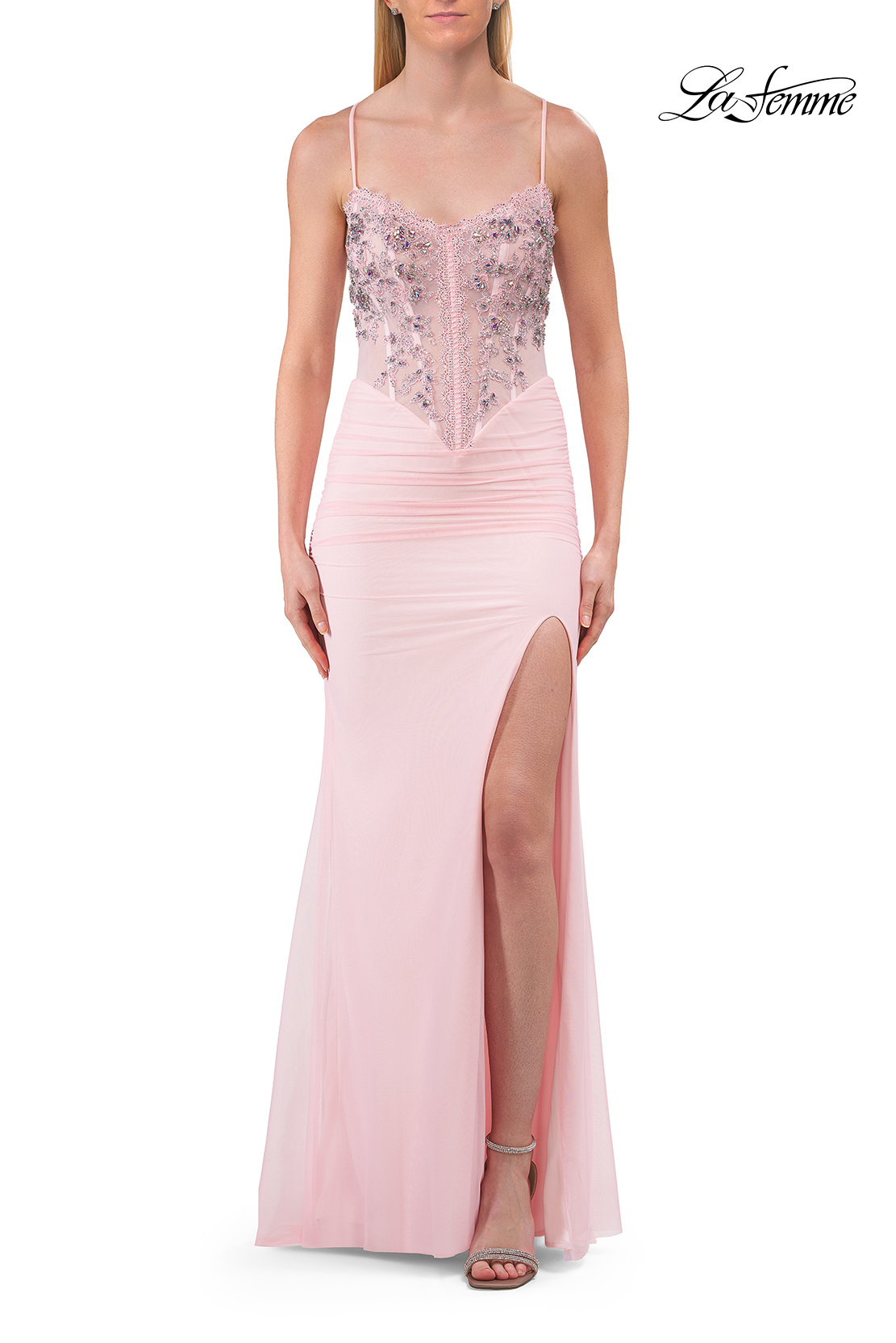 This elegant gown showcases a sheer corset bodice adorned with intricate floral embroidery and delicate beading. The fitted silhouette features soft ruching that flatters the figure and a high side slit for added allure. Finished with a crisscross open back, this design is perfect for prom or any formal occasion. Back zipper closure.