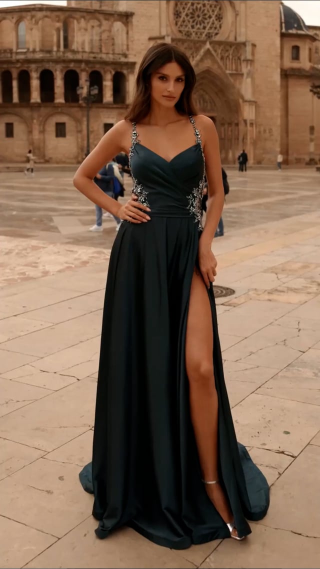 This flowing A-line gown features a ruched bodice with delicate embellishments that trace the straps and sides for a touch of sparkle. The floor-length satin skirt includes a thigh-high slit for movement and allure, while the open back with crisscross straps adds a stunning finishing detail. Back zipper closure.