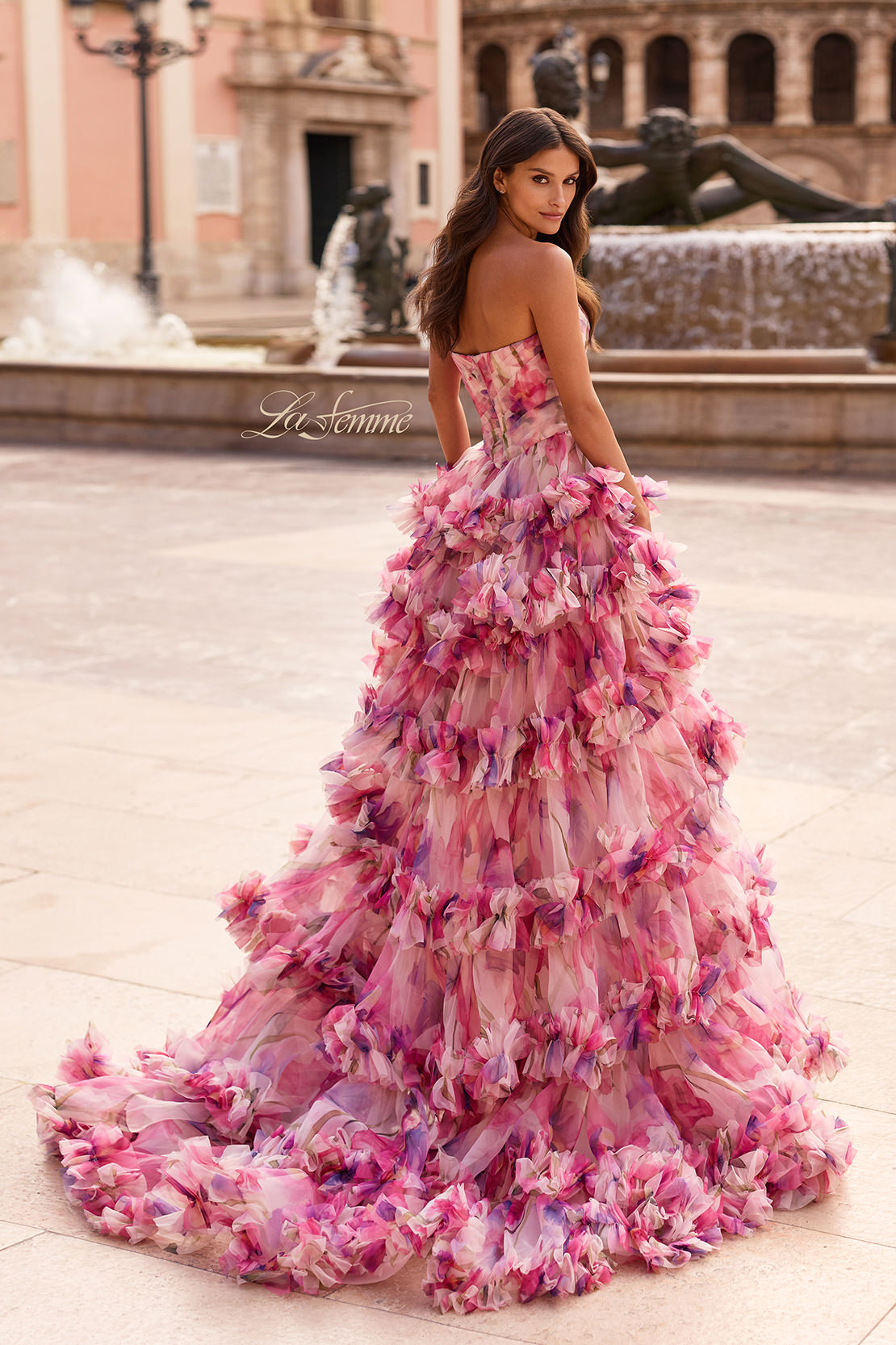This romantic strapless gown features a layered ruffle skirt with cascading floral tiers for a dreamy, voluminous effect. The structured bodice offers a flattering fit, while the high slit adds a modern, flirty touch. Back zipper closure.