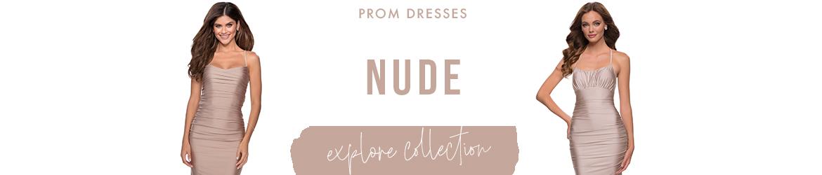 A neutral gown is a timeless option and La Femme offers some of the best nude and champagne prom dresses to choose from. Here you will find everything from simple nude prom gowns to more elaborate and sequin designs so that every girl can pick the style that is best for her. Explore our collection that includes simple long jersey dresses with beaded straps, stunning A-line gowns with pretty lace detailing, mermaid prom dresses with dazzling open beaded backs, and so much more. Nude is anything but boring and you are sure to look chic and sophisticated when you opt for a stunning nude gown for all of your events.