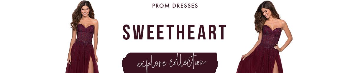 Sweetheart necklines are arguably the most classic and widely popular neckline for prom dresses across the board. Sweetheart neckline prom dresses can come in any style including strapless prom dresses, off the shoulder prom dresses, cap sleeve prom dresses, sequin prom dresses, velvet prom dresses, and so much more. With hundreds of La Femme designs to choose prom, finding a sweetheart prom dress that fit your personal style is simple. Try an A-line sweetheart tulle prom dress with sequins or black sweetheart prom dress with pretty floral embellishments. La Femme also offers countless plus size prom dress options in this flattering shape in colors like pink, red, and blue. This universal design looks amazing on everyone and allows every girl to look and feel her best when it matters most.