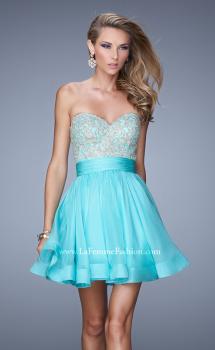 Charming chiffon cocktail dress with a sweetheart neckline and tiered skirt. The bodice features a contrasting jeweled lace overlay. Back zipper closure.